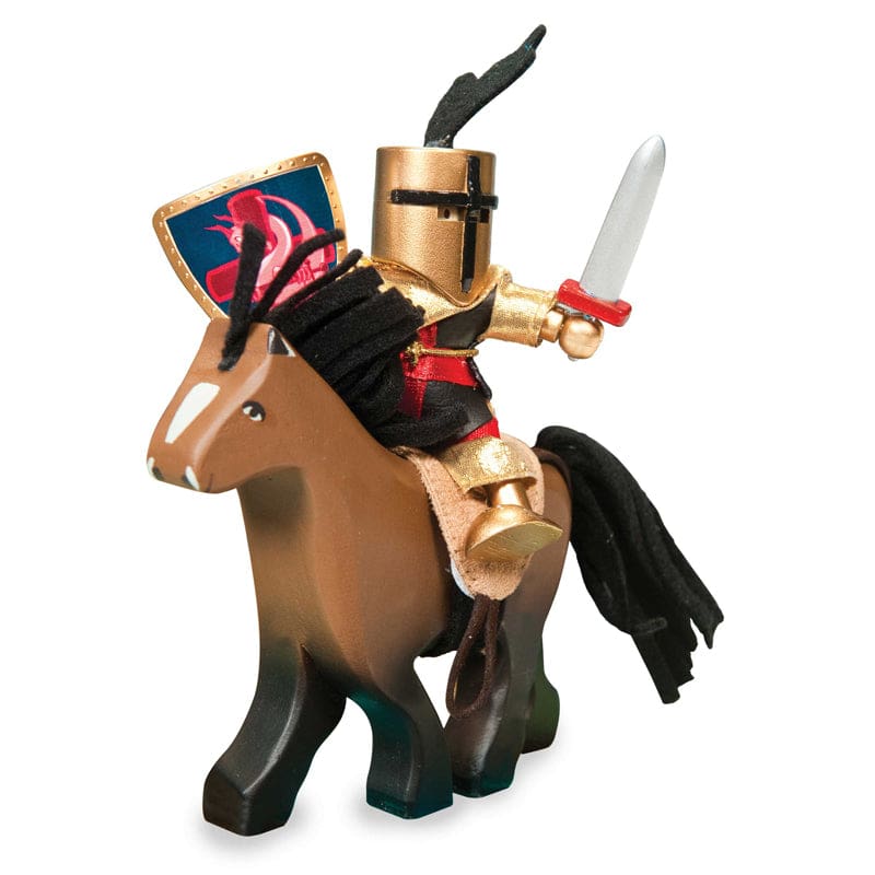 Pour enrichir l’univers des chevaliers, des princesses et des châteaux, ce cheval joue le rôle du noble destrier qui pourrait permettre au chevalier doré (le plus puissant des trois chevaliers) d’influencer le cours de la bataille. Même s’il semble être un simple canasson, il ne faut pas le sous-estimer. Avec son allure athlétique et ses puissantes pattes arrière, il offre une vitesse incomparable à toute personne capable de le dompter. Comme l’illustre la deuxième image, ce cheval est conçu pour s’adapter aux chevaliers en bois de la même marque, Le Toy Van, leur permettant de monter sans difficulté.