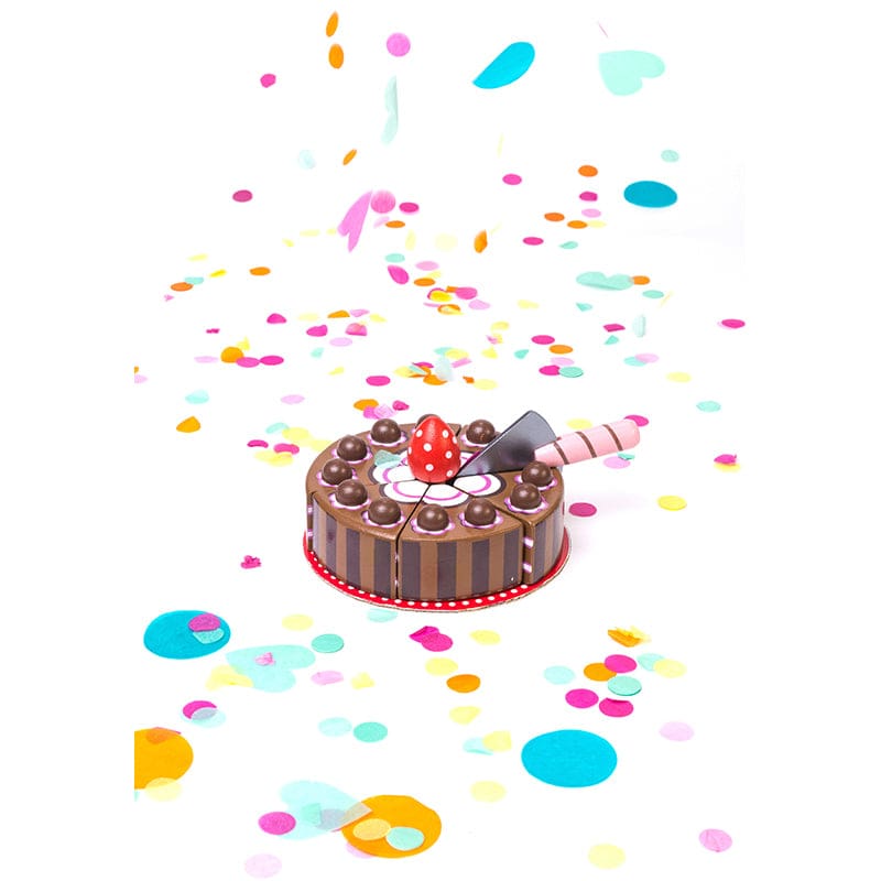 Ce jouet inclut également une pelle à gâteau pour détacher facilement les six parts une à une, facilitant ainsi leur distribution. Chaque morceau est joint par un velcro permettant une reconstitution aisée, empêchant ainsi la dispersion des parts durant le jeu.