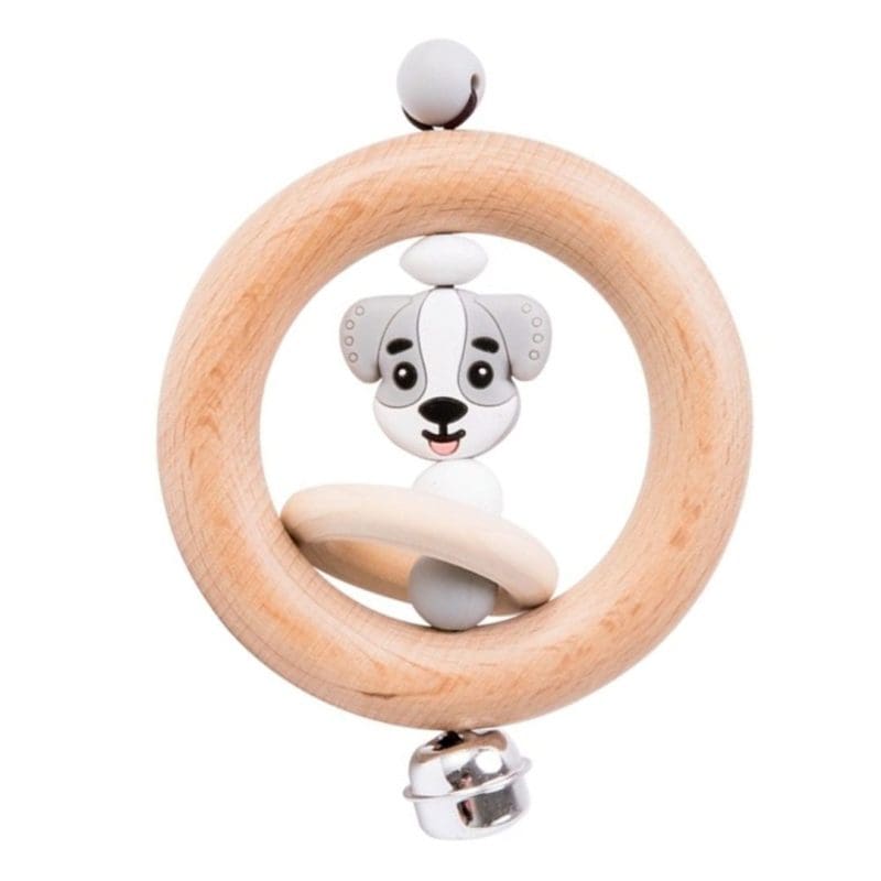 Avec sa langue rose et ses petites oreilles grises, ce chiot intégré au hochet charmera aussi bien les filles que les garçons.