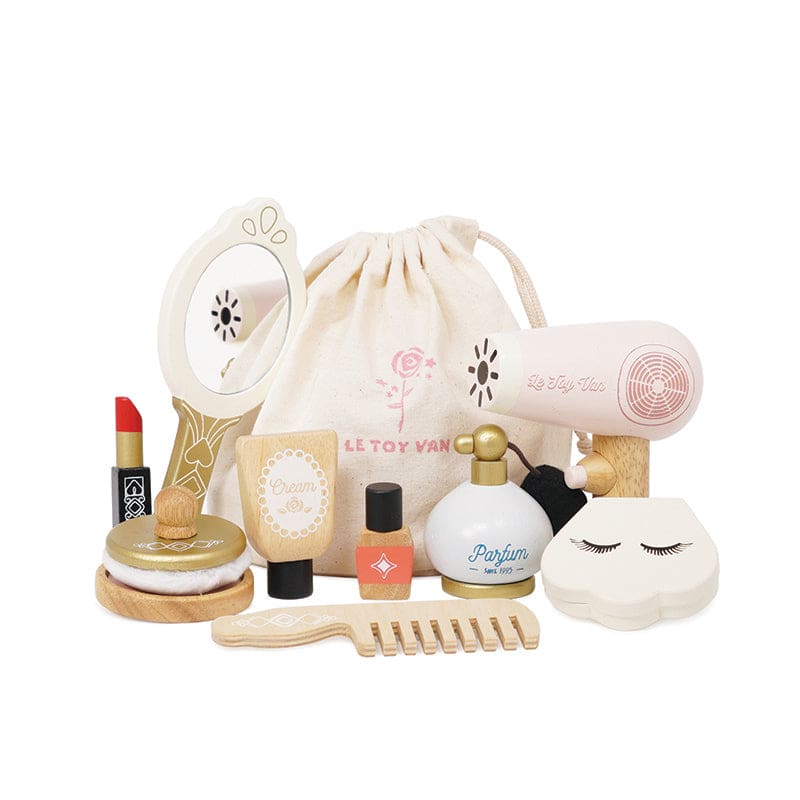 Destinés aux enfants dès trois ans, ces accessoires de beauté sont parfaits pour offrir les premiers outils de maquillage à une petite fille. Entièrement factices, ils permettent de s’amuser à se maquiller et à se coiffer comme une grande avec une grande variété d’ustensiles de beauté. Parmi eux, on trouve notamment un miroir, un parfum, un sèche-cheveux, un peigne, un rouge à lèvres, une palette de maquillage et bien d’autres encore que vous pourrez découvrir sur la deuxième photo.